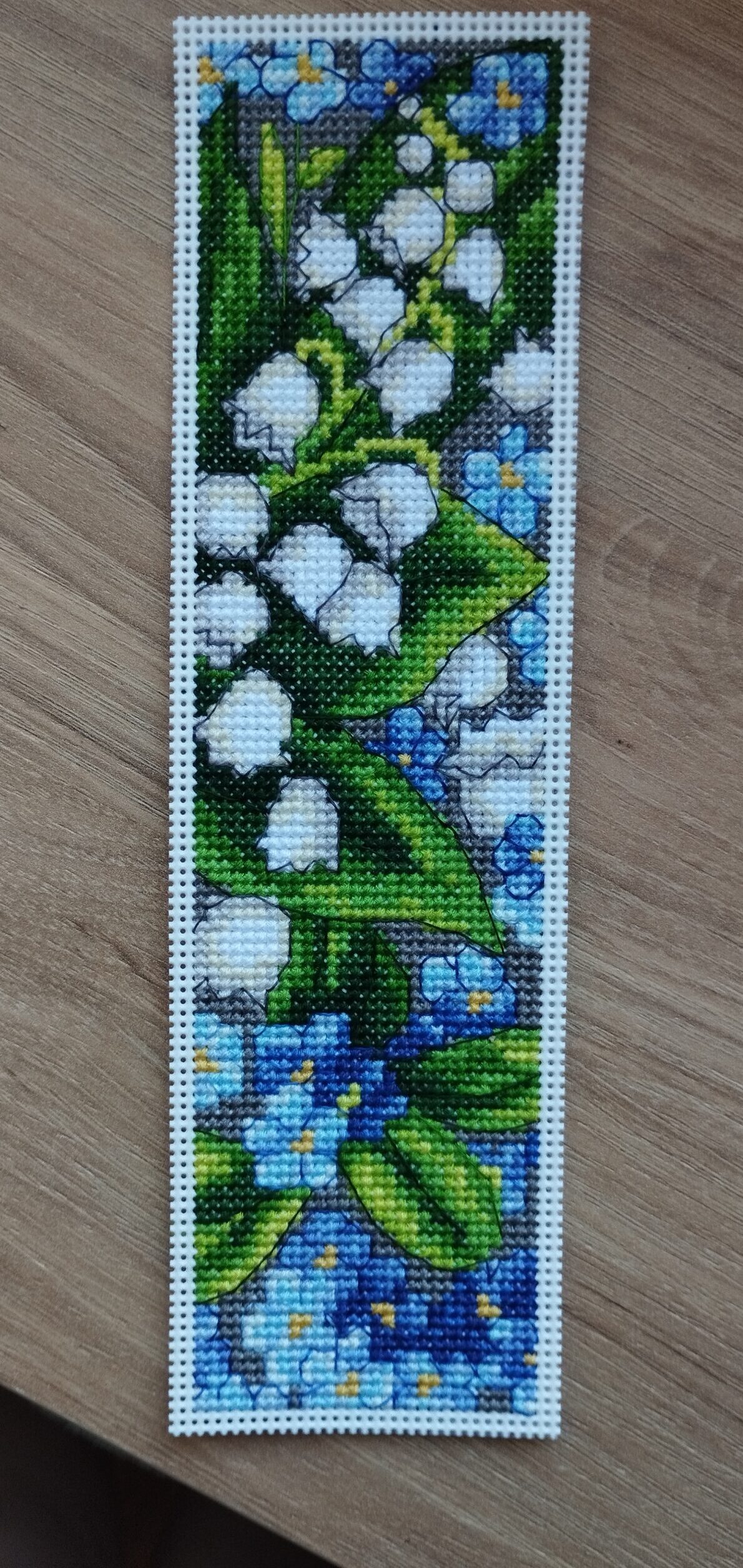 Jako pierwszą przedstawiam zakładkę z konwaliami i niezapominajkami – osobiście konwalie uwielbiam, dlatego wiedziałam, że po prostu muszę ją sobie wyszyć. Wzór jest autorstwa Coricamo. Zakładka została wyszyta na białej kanwie plastikowej mulinami Ariadna. Tył zabezpieczyłam, przyszywając do zakładki kawałek filcu.